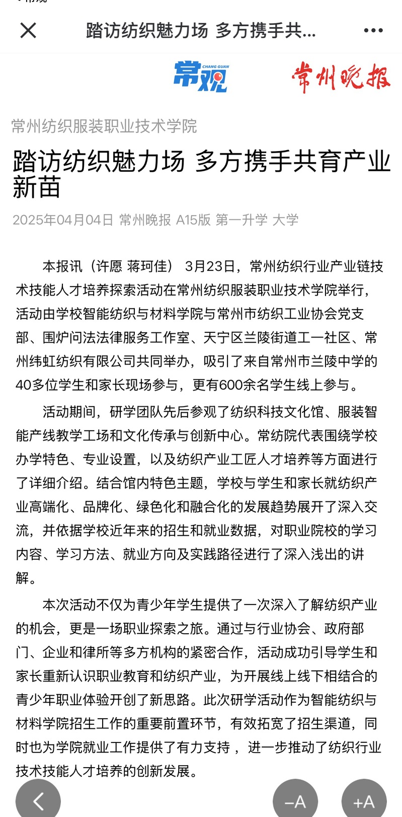 • 常州晚報|常州紡織服裝職業技術學院:踏訪紡織魅力場 ...